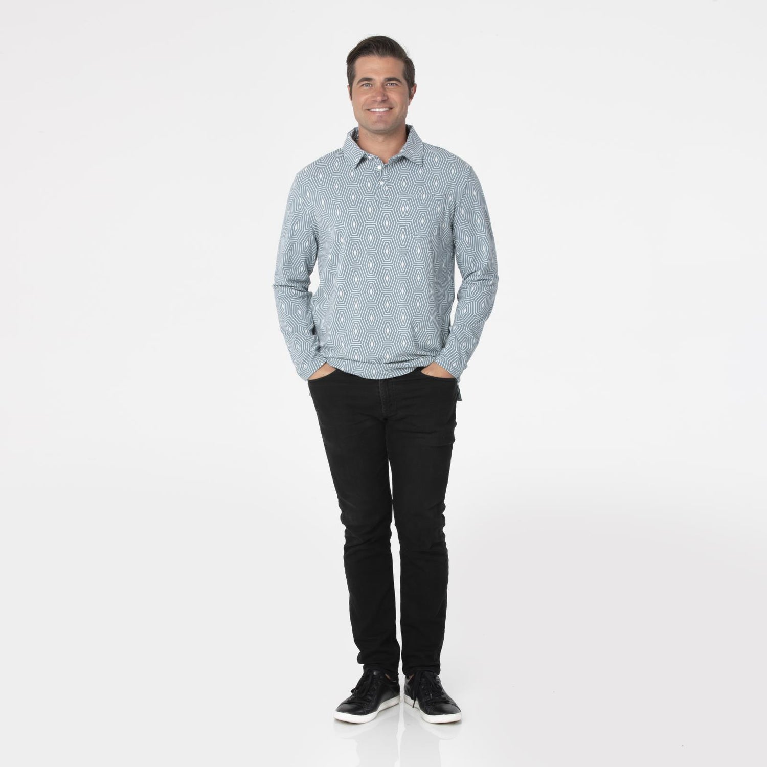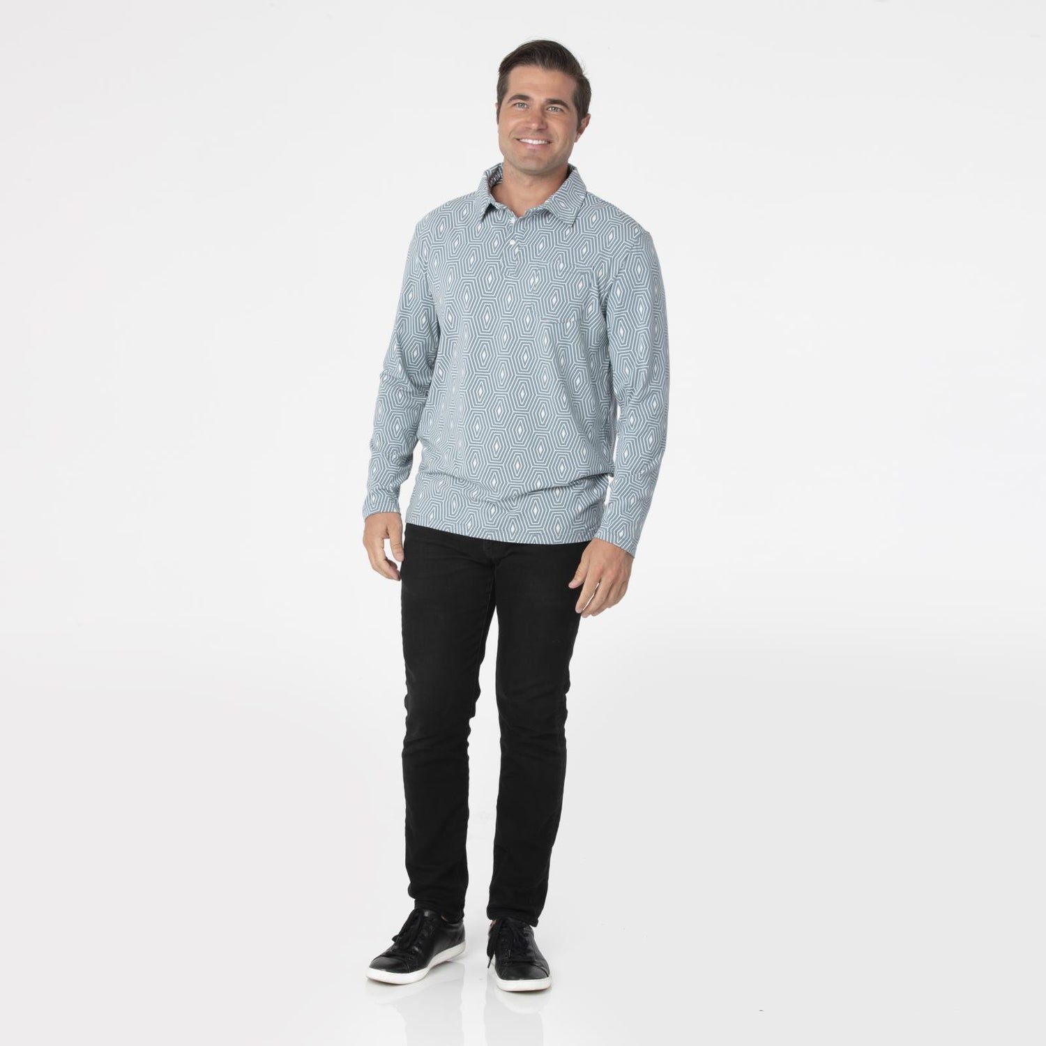 Men's Print Long Sleeve Luxe Jersey Polo with Pocket in Dusty Sky Tortoise Shell