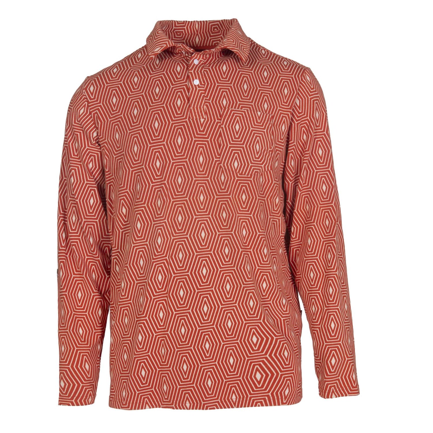 Men's Print Long Sleeve Luxe Jersey Polo with Pocket in Red Tea Tortoise Shell
