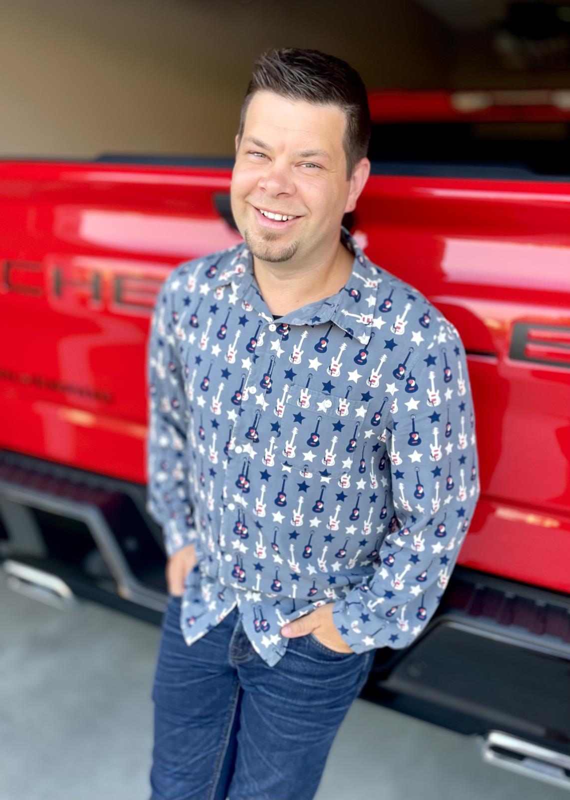 Men's Print Long Sleeve Woven Button-Down Shirt in Slate Guitars and Stars