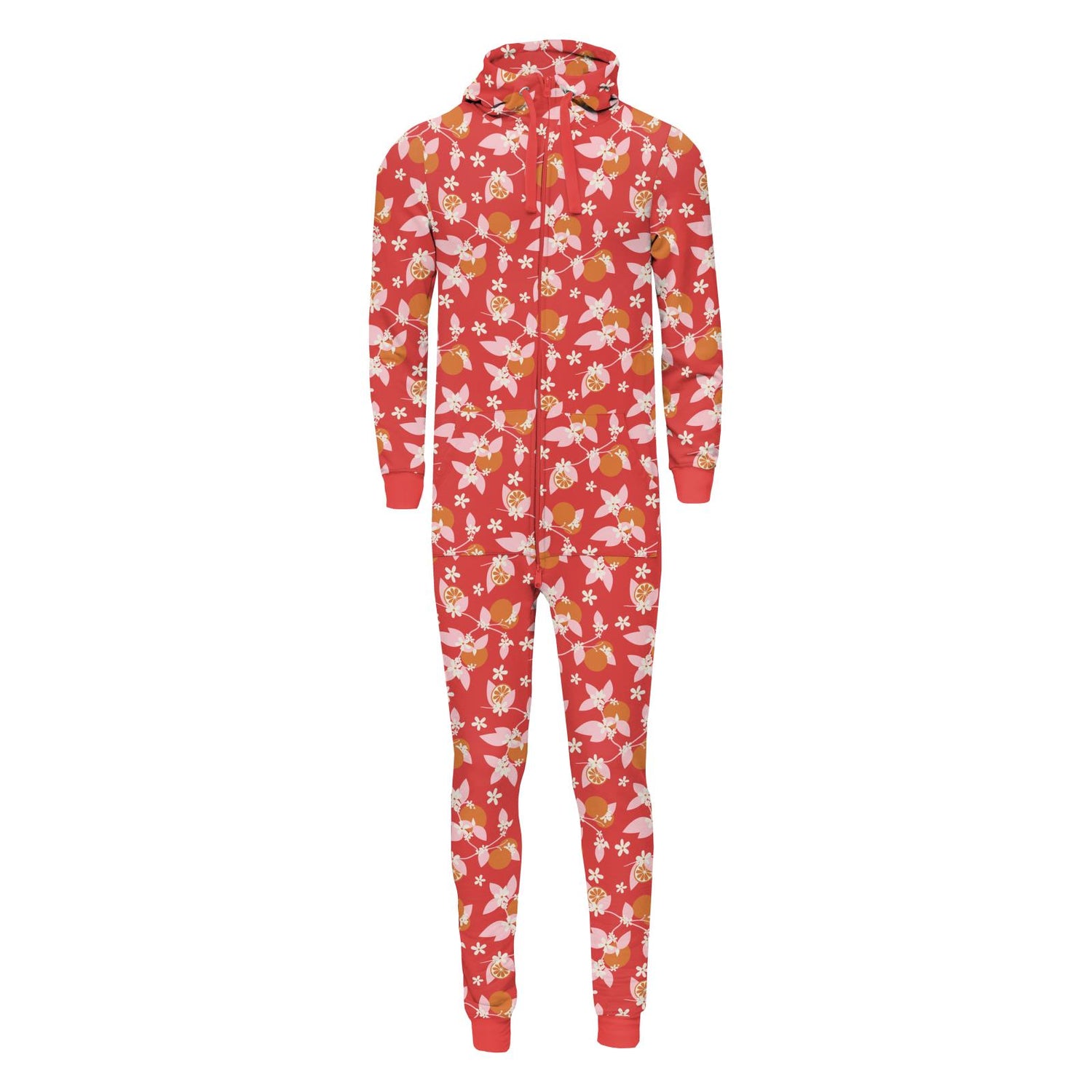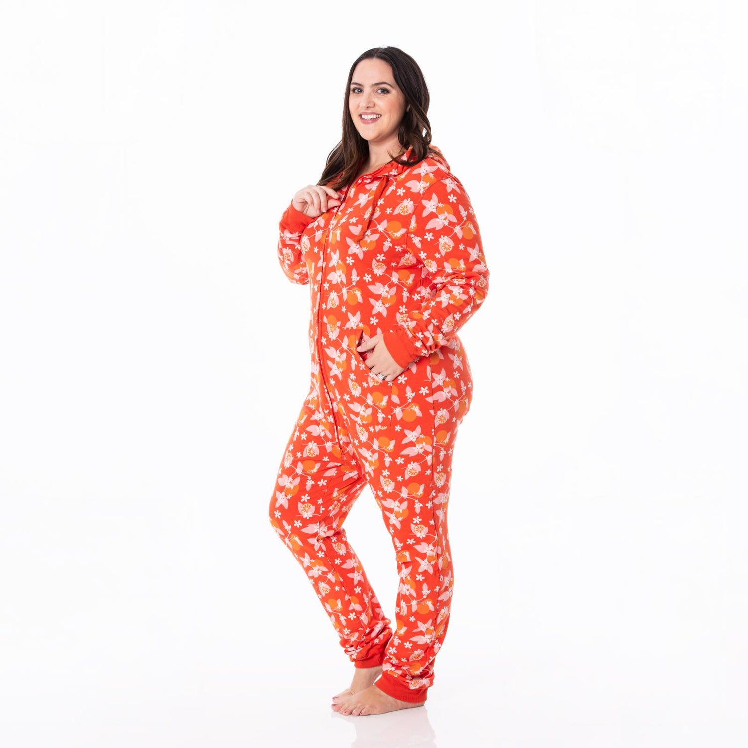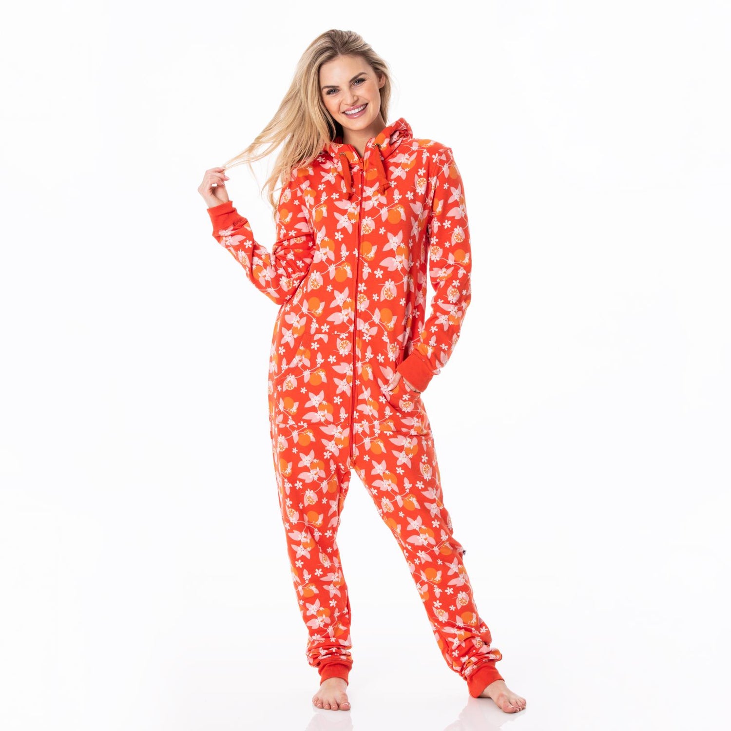 Print Adult Fleece Jumpsuit with Hood in Poppy Orange Blossom