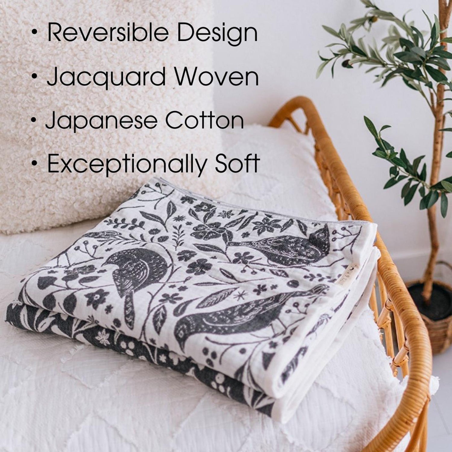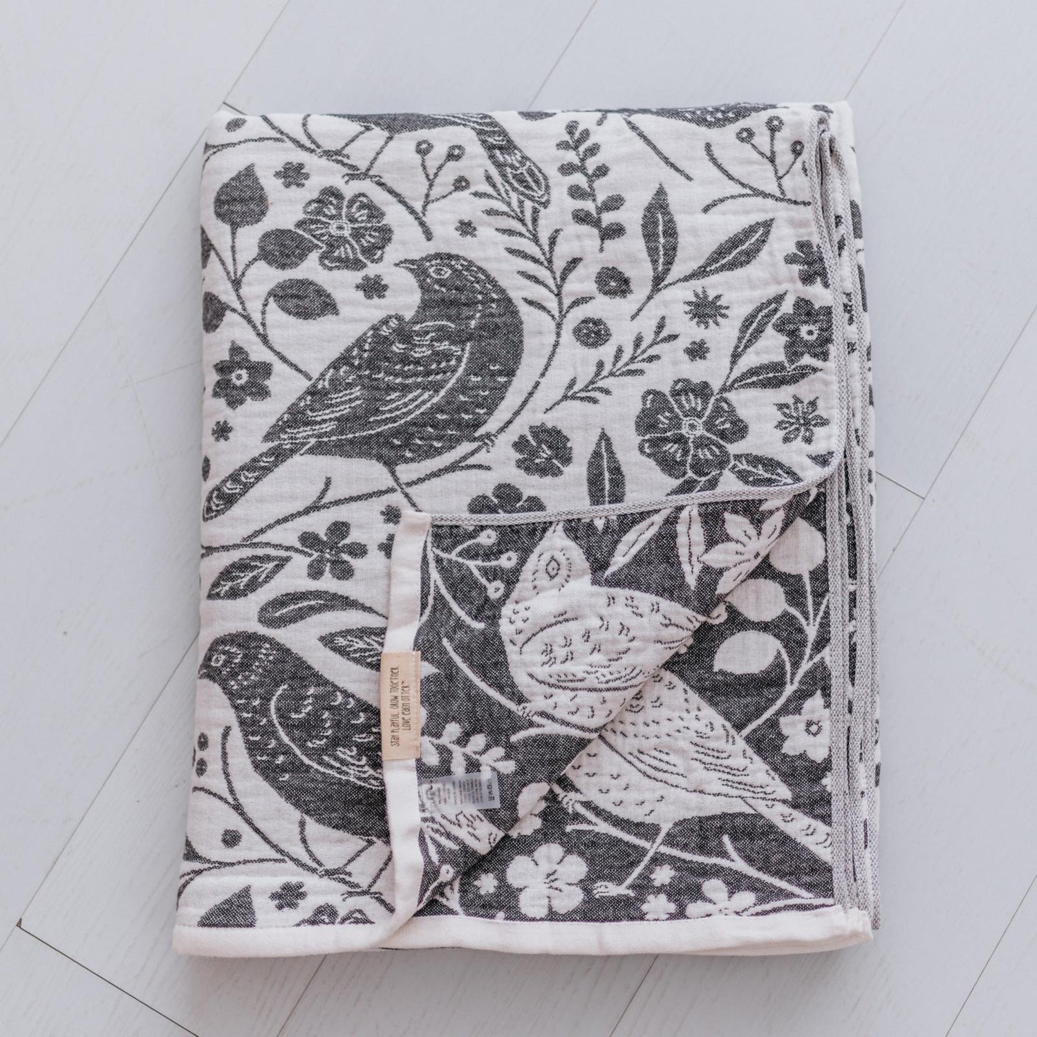 Soft Spun Cotton Jacquard Muslin Blanket 55 x 75 in Coconut Milk/Raven Forest Birds