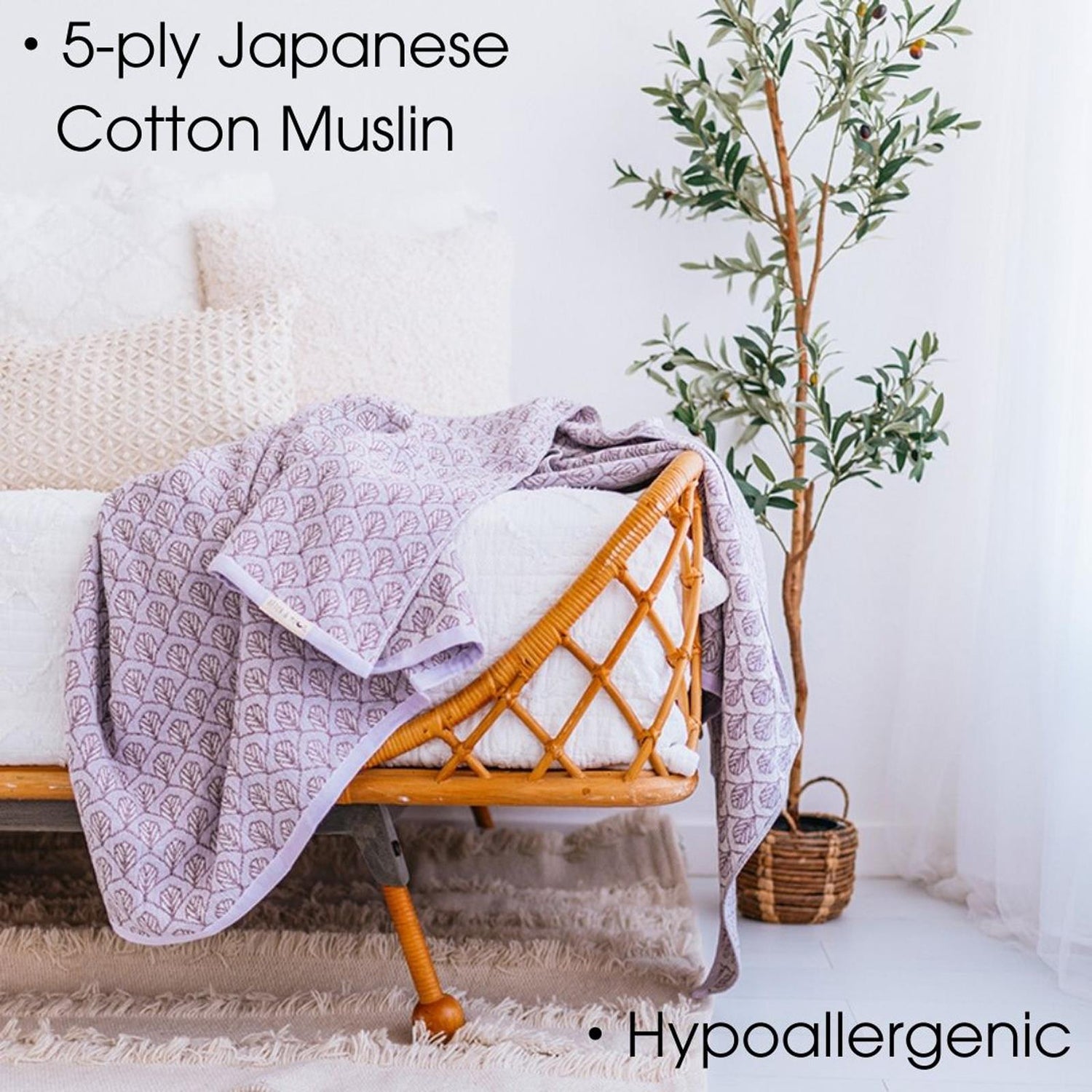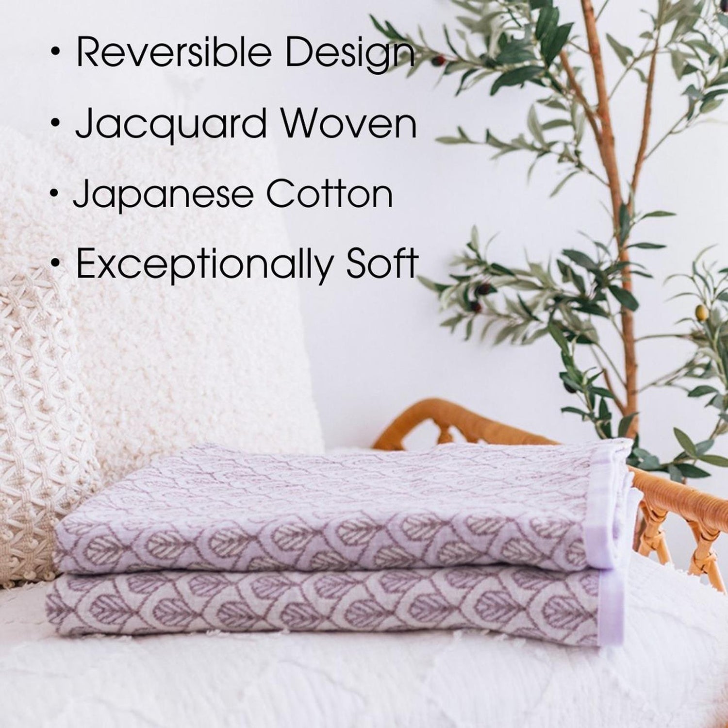 These 100% cotton muslin blankets are expertly made in Japan using a special soft-spun technique that enhances the natural softness of the cotton. Designed to be breathable, durable, and incredibly gentle on the skin, they're ideal for anyone seeking everyday comfort with elevated craftsmanship. The plush 6-ply construction provides cozy weight and long-lasting quality, making these blankets both comforting and beautiful. Each design is skillfully woven - not printed - using a jacquard technique, resulting in a fully reversible, double-sided pattern that adds timeless elegance to any space.