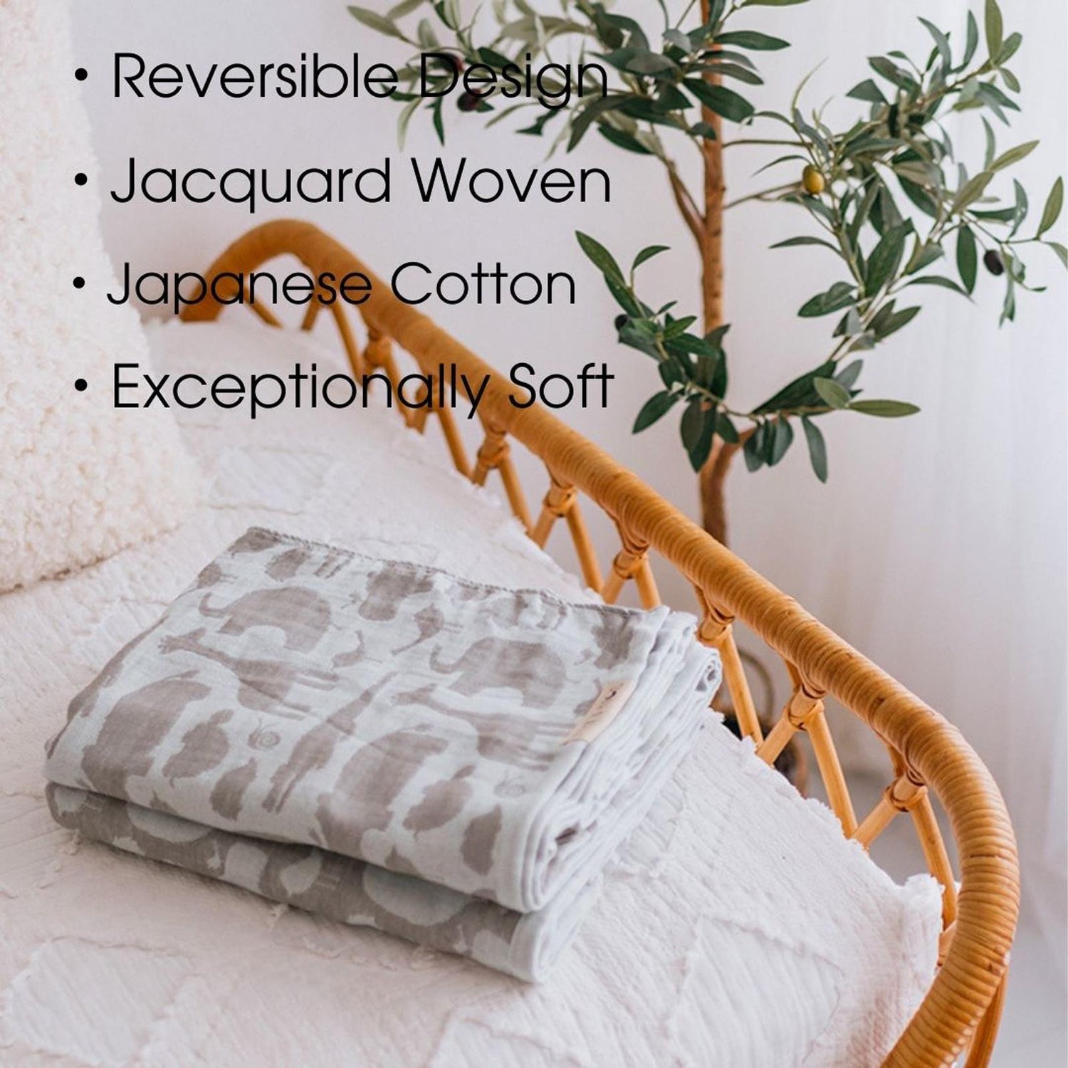 These 100% cotton muslin blankets are made in Japan using a special soft-spun technique that enhances the natural softness of the cotton. Lightweight, breathable, and gentle on the skin, they're perfect for even the most sensitive users. Their incredible versatility makes them ideal as swaddling blankets, nursing covers, stroller covers, or cozy throws. Each design is woven - not printed - using a jacquard technique, giving the blankets a beautiful, double-sided finish that's as elegant as it is functional.