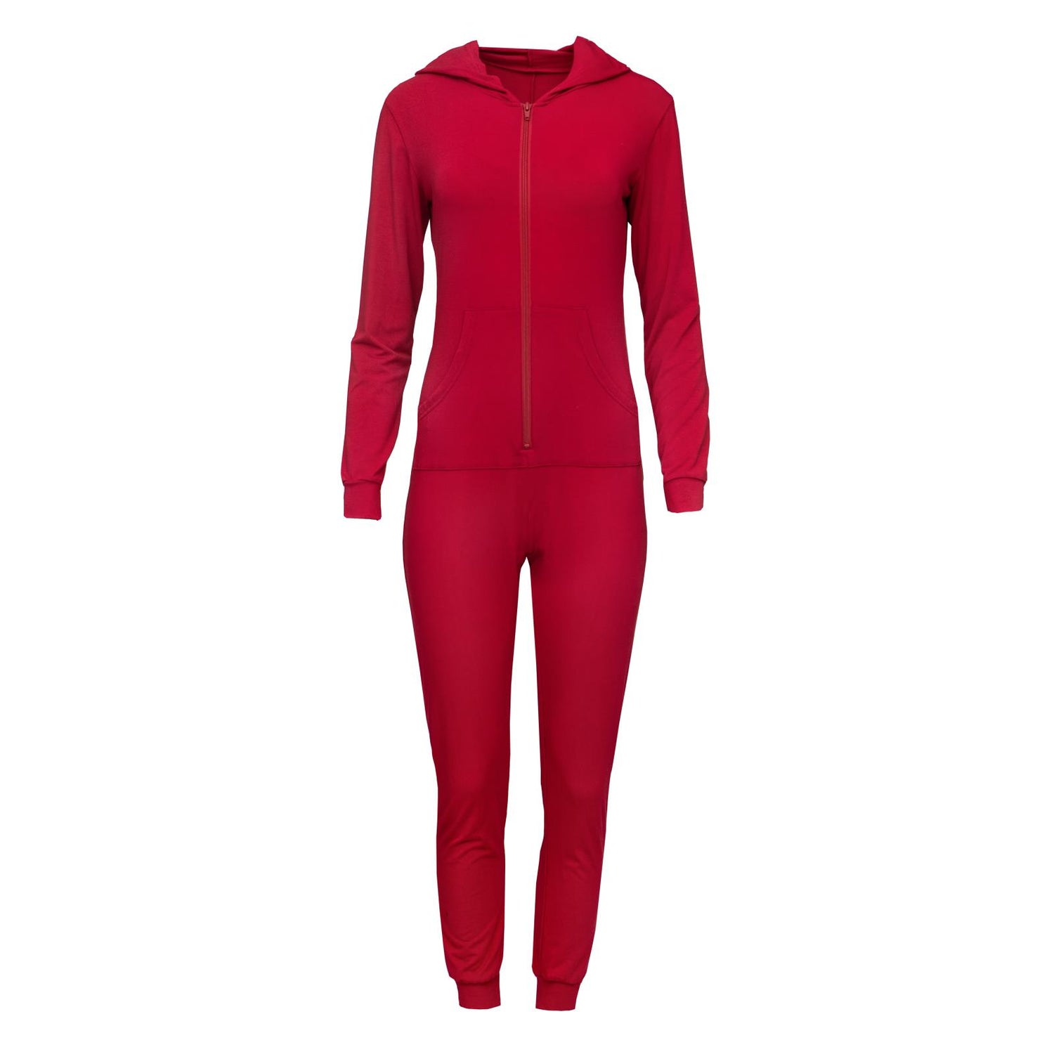 Women Long Sleeve Jumpsuit with Hood in Crimson