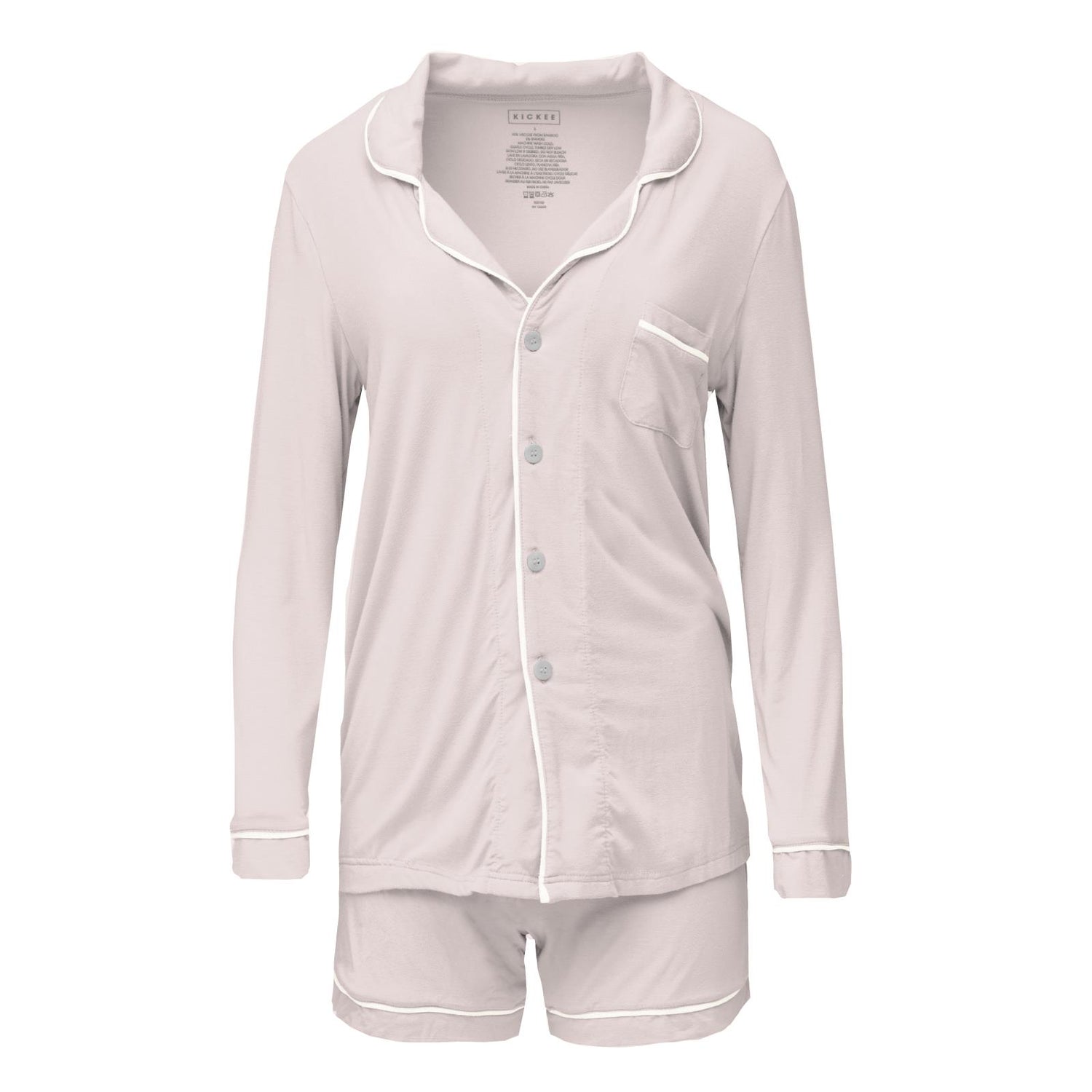 Women's Long Sleeve Collared Pajama Set with Shorts in Macaroon with Natural