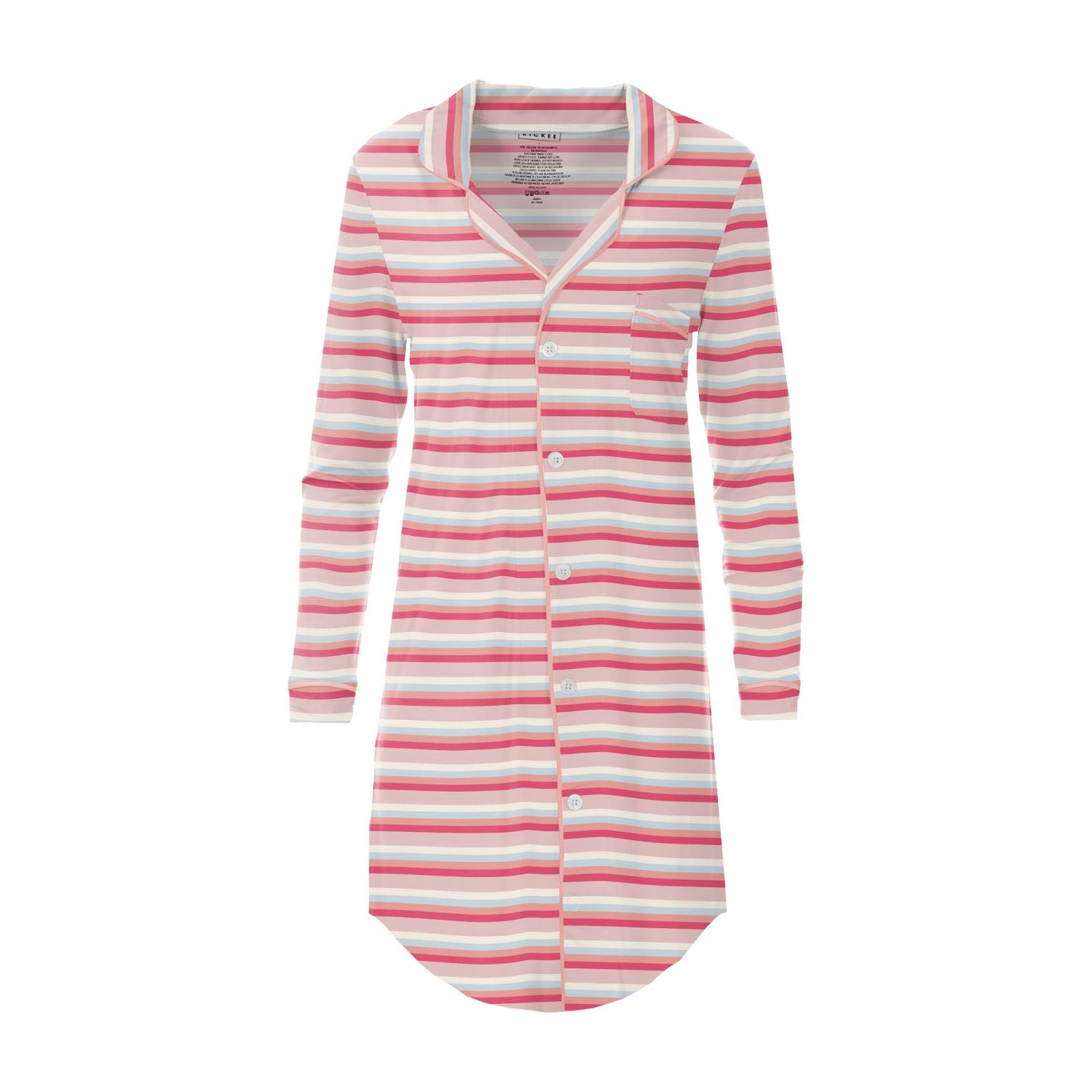 Women's Print Long Sleeve Button Down Nightshirt in Baby Rose Stripe