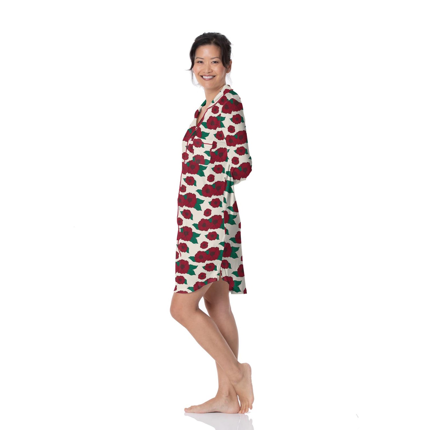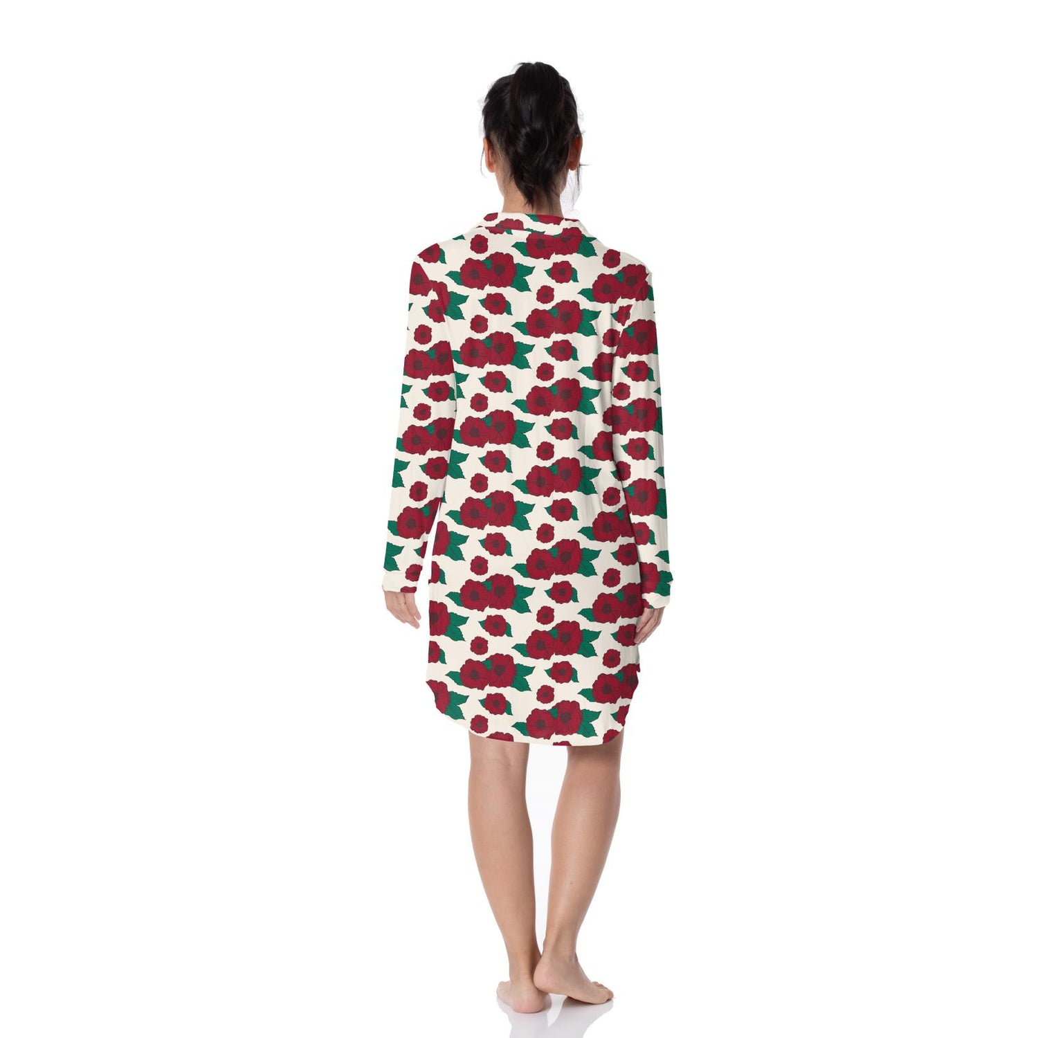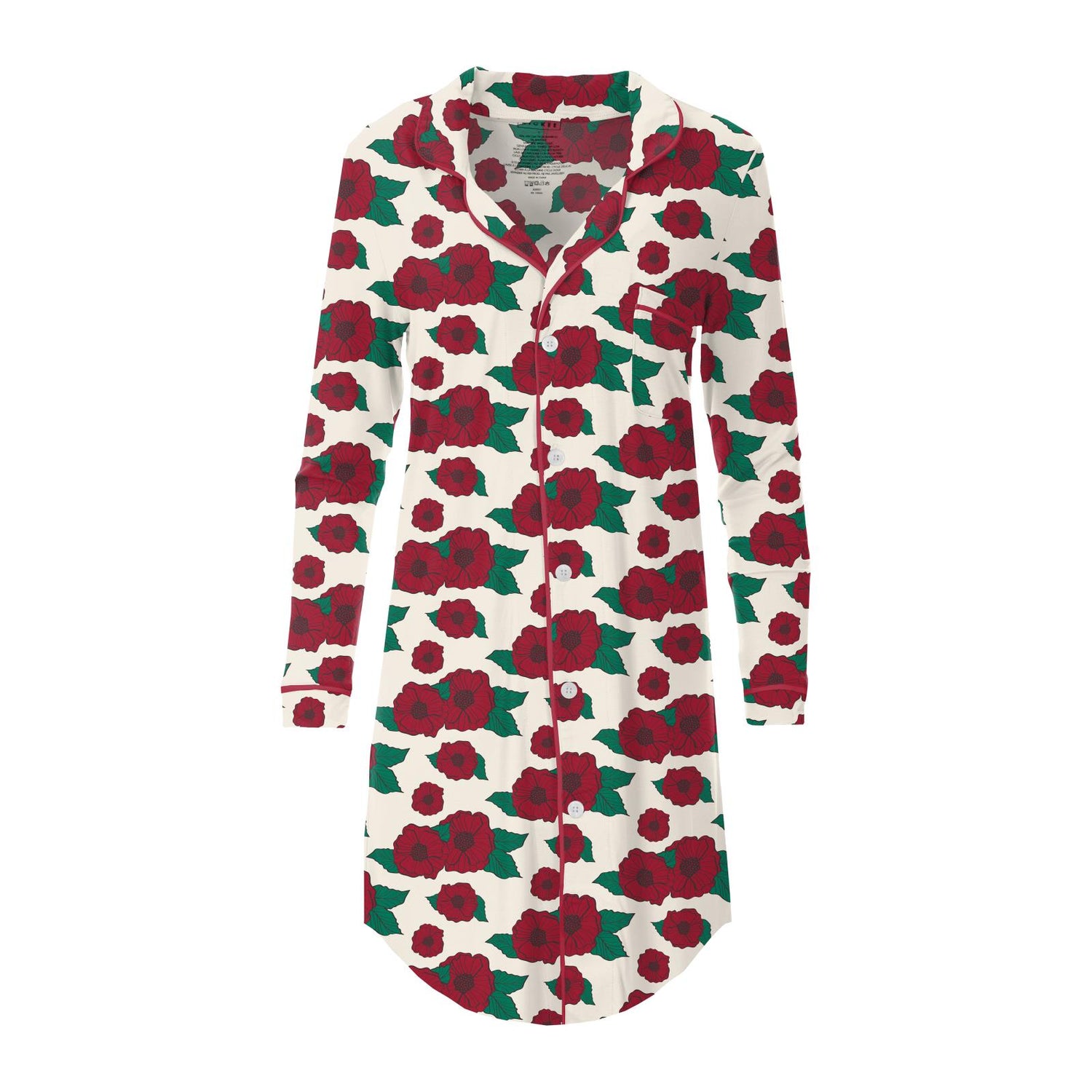 Women's Print Long Sleeve Button Down Nightshirt in Holiday Poppies