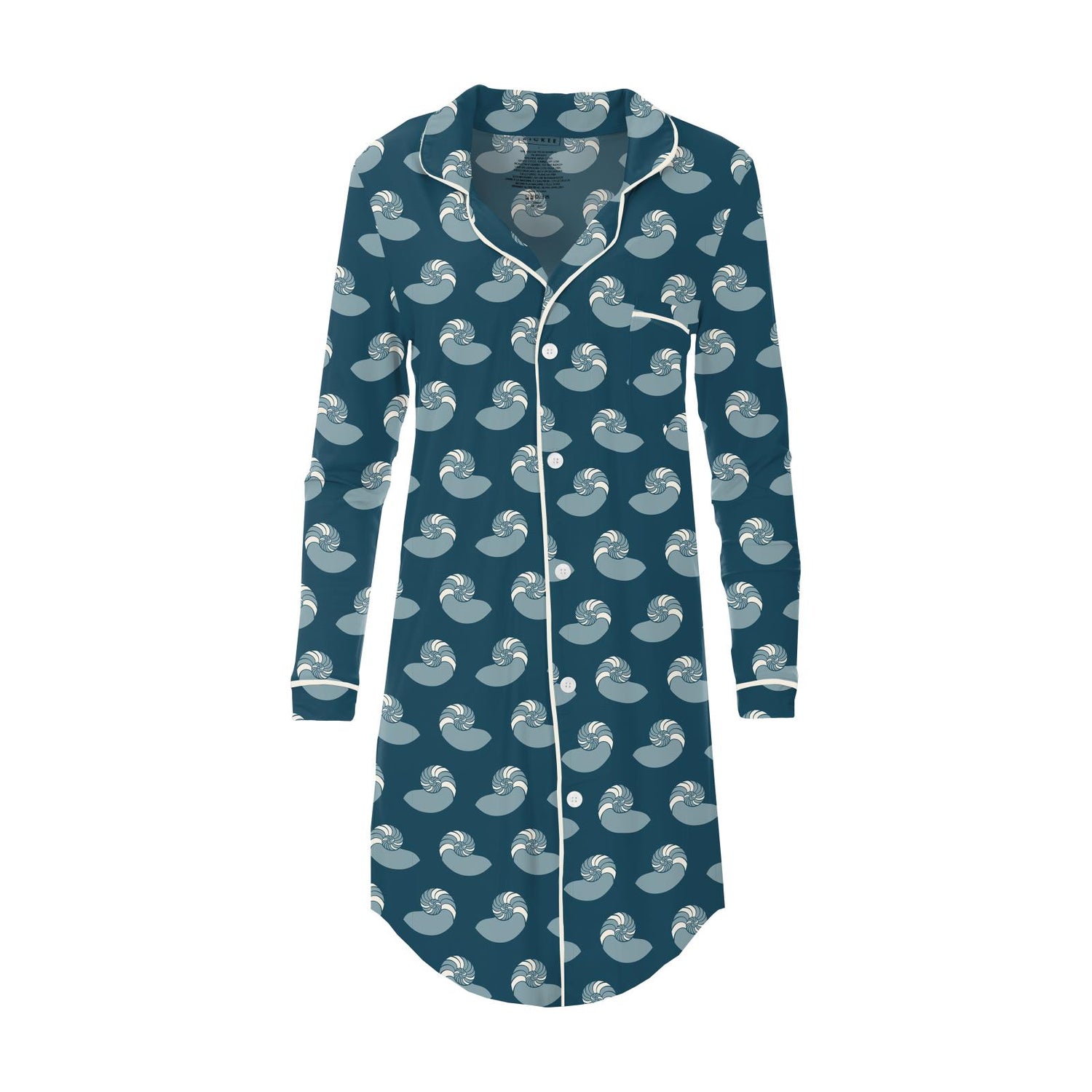 Women's Print Long Sleeve Button Down Nightshirt in Peacock Nautilus
