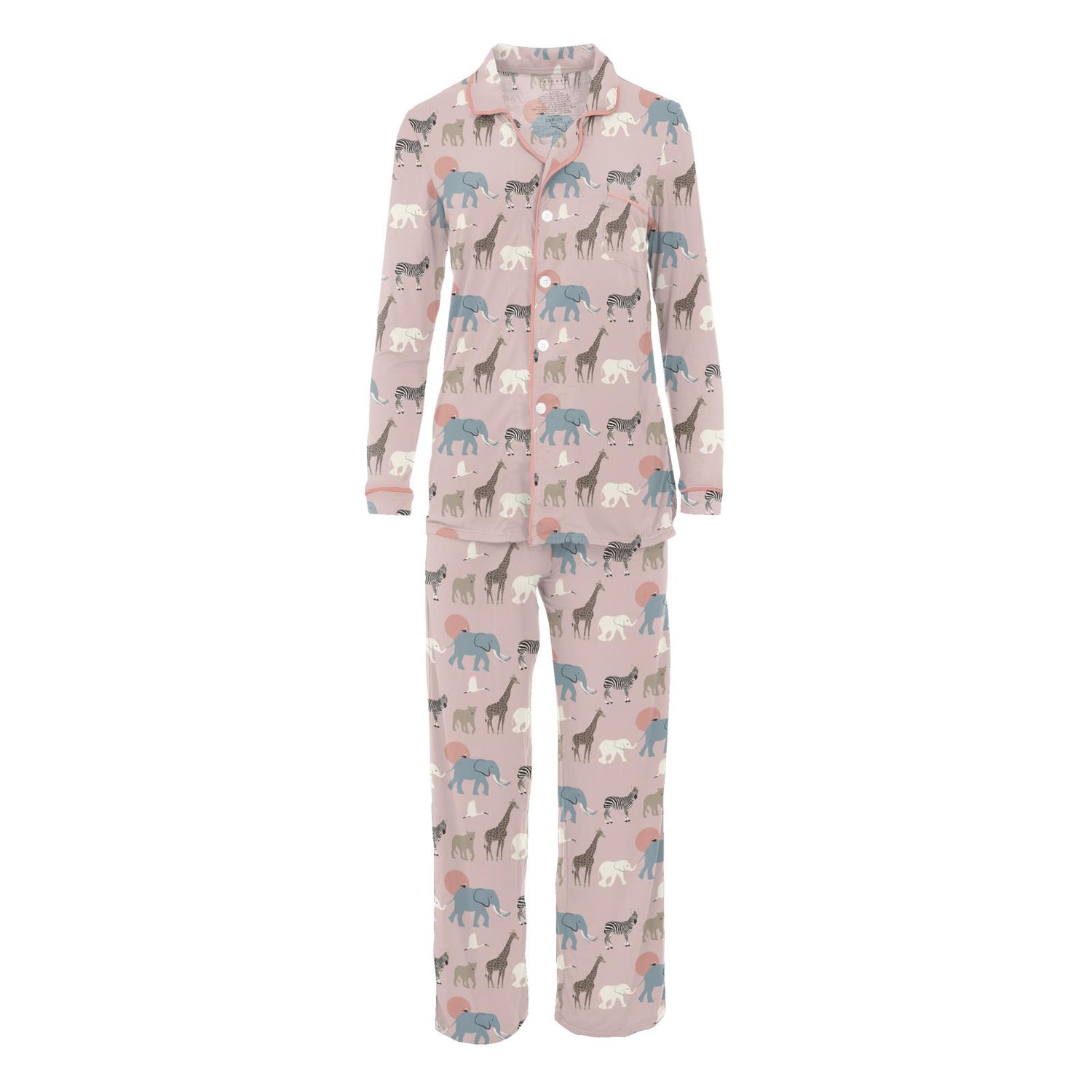 Women's Print Long Sleeve Collared Pajama Set in Baby Rose Just So Animals