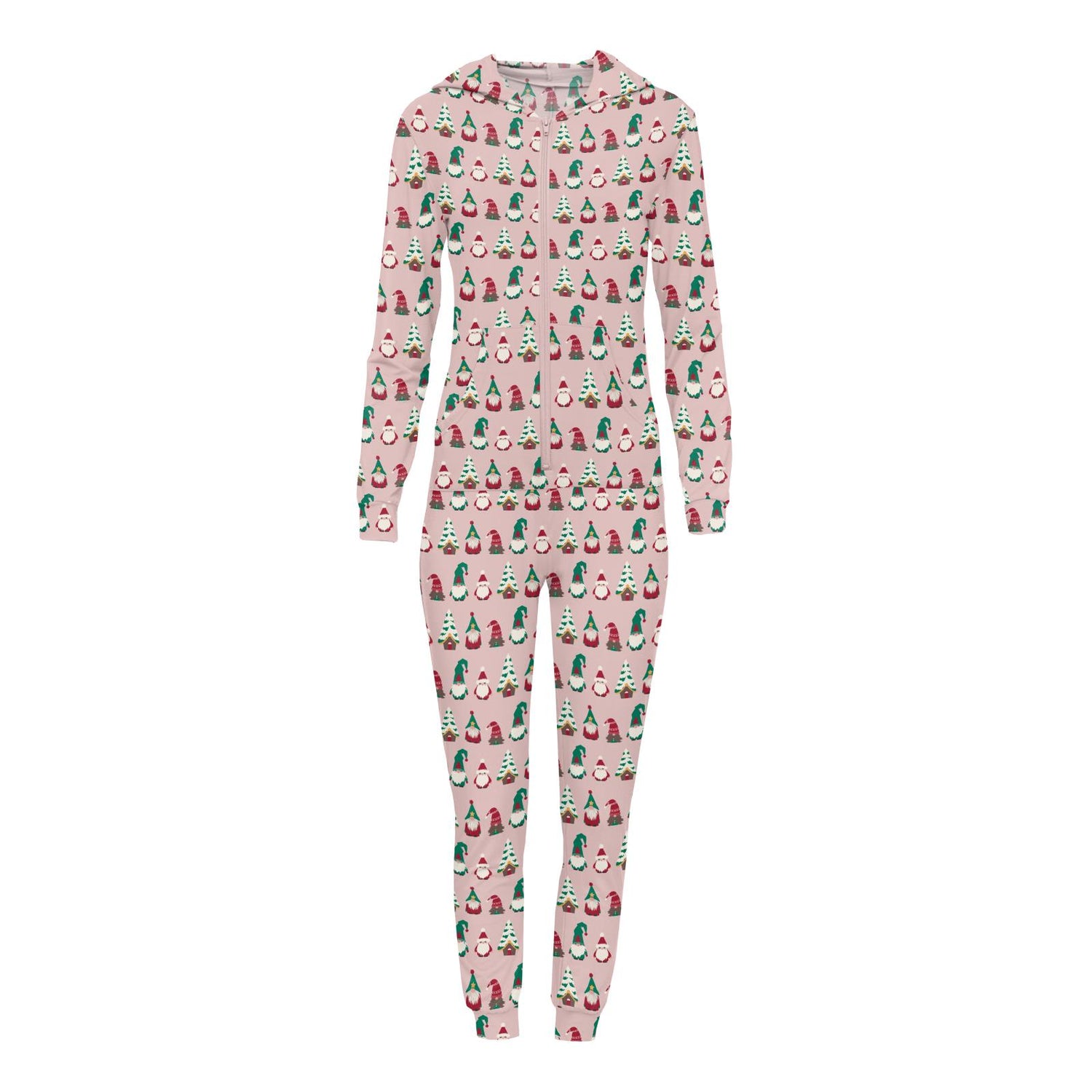 Women's Print Long Sleeve Jumpsuit with Hood in Baby Rose Gnomes