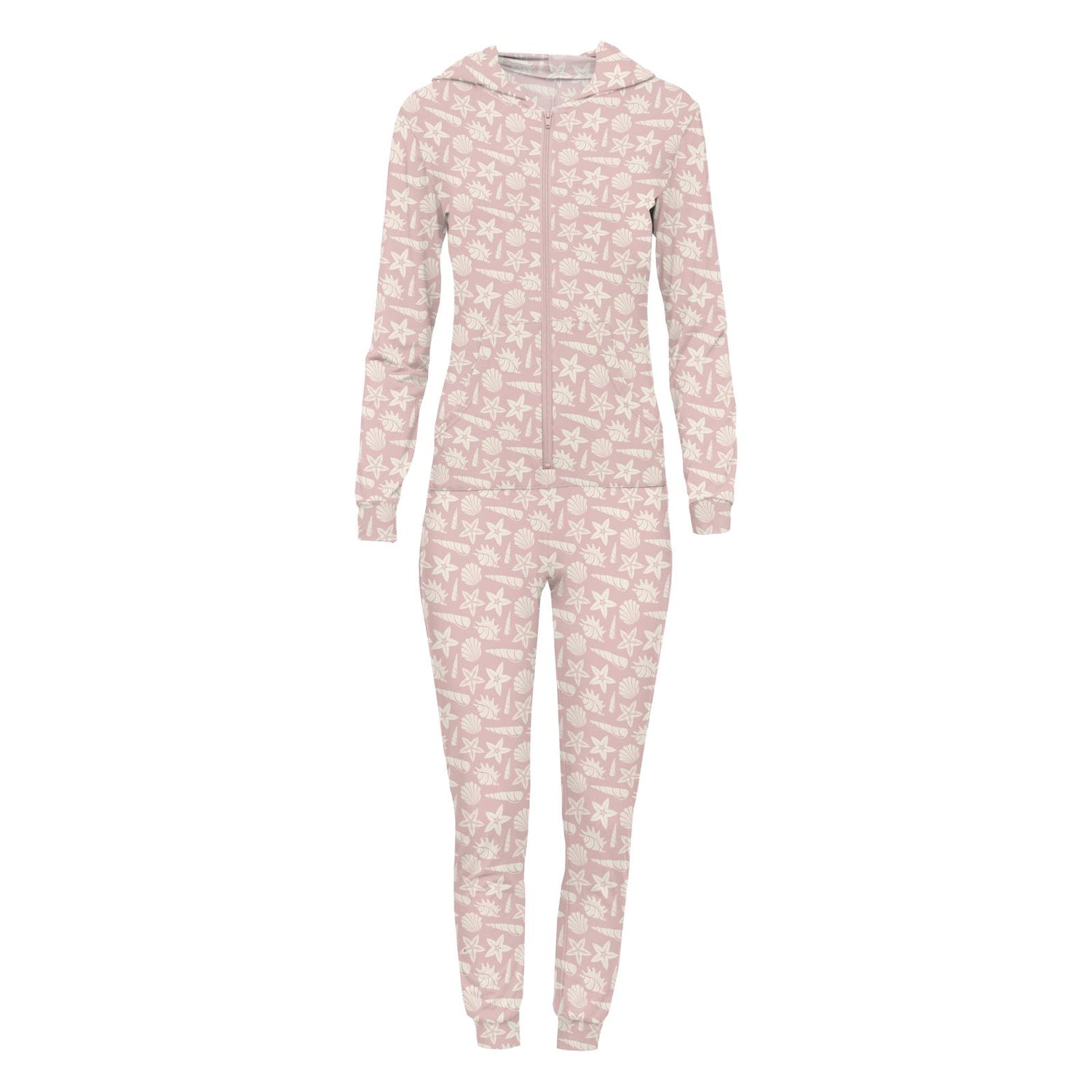 Women's Print Long Sleeve Jumpsuit with Hood in Baby Rose Shells & Starfish