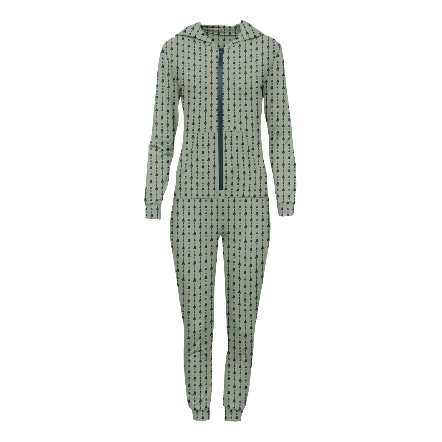 Women's Print Long Sleeve Jumpsuit with Hood in Silver Sage Trees & Hearts