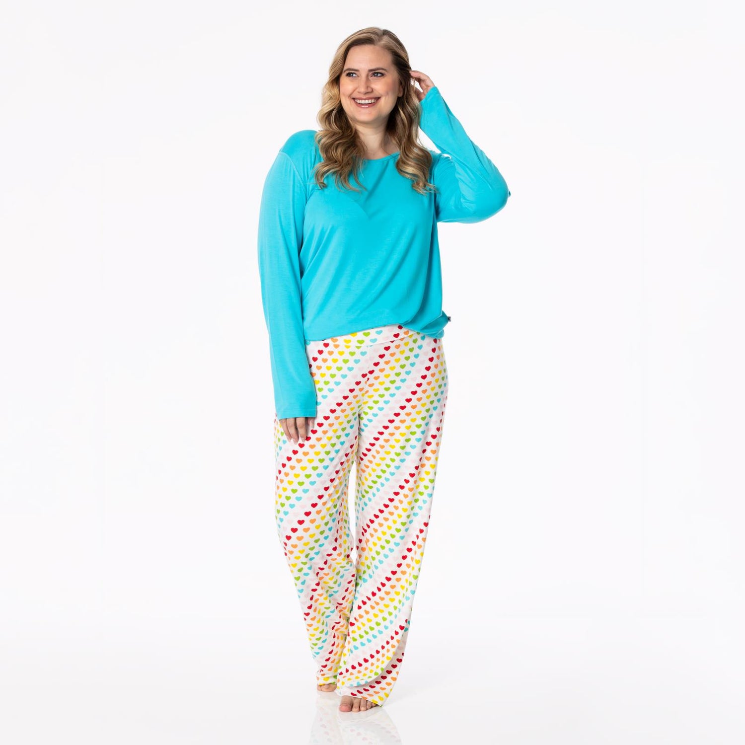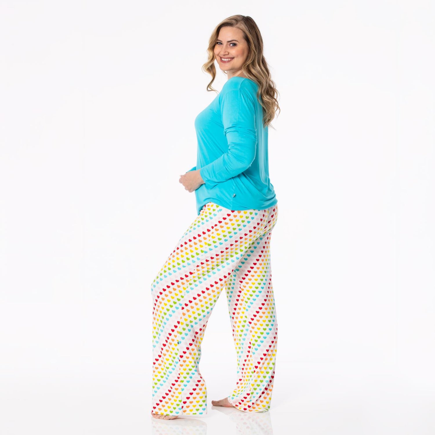 Women's Print Long Sleeve Relaxed Tee & Pajama Pants Set in Rainbow Hearts