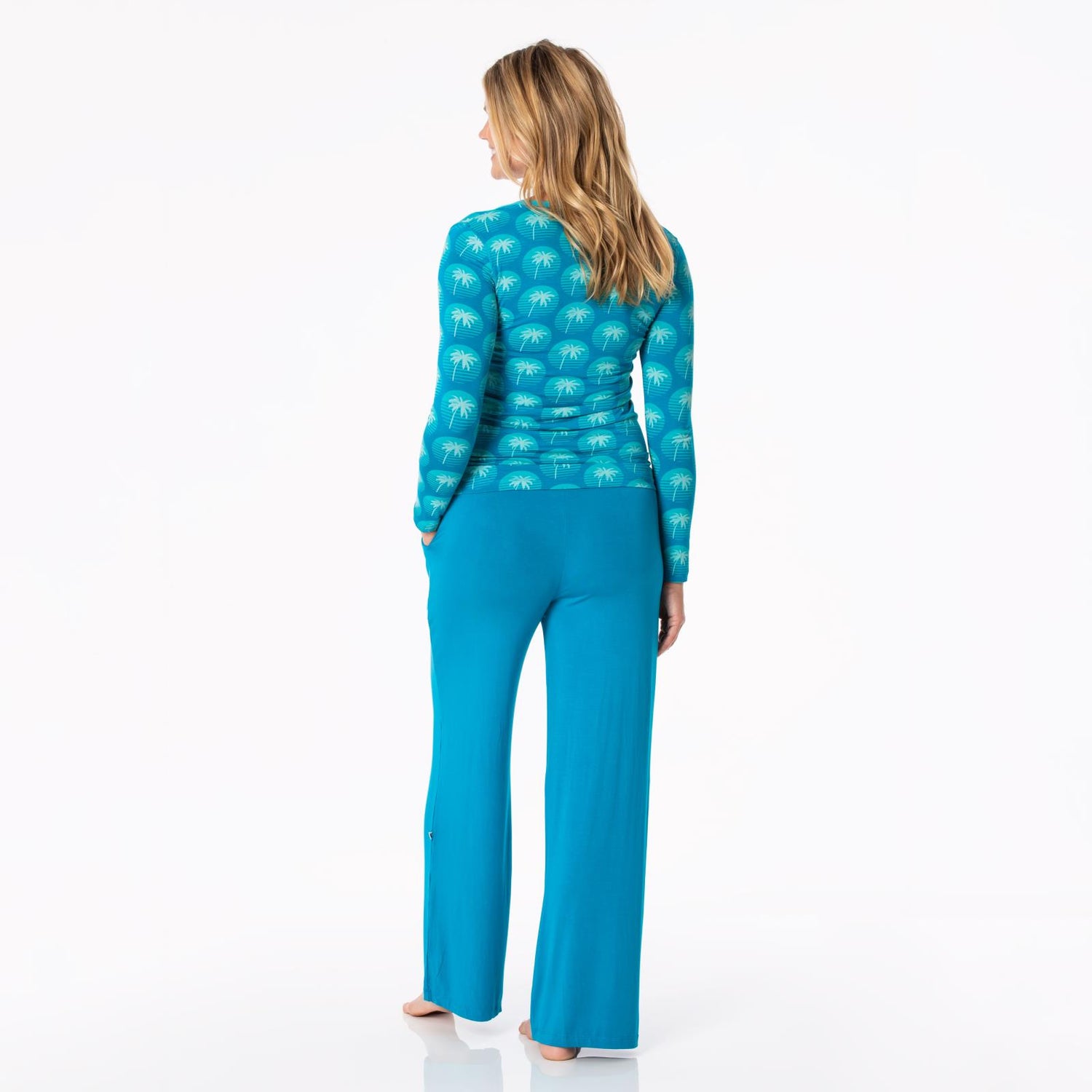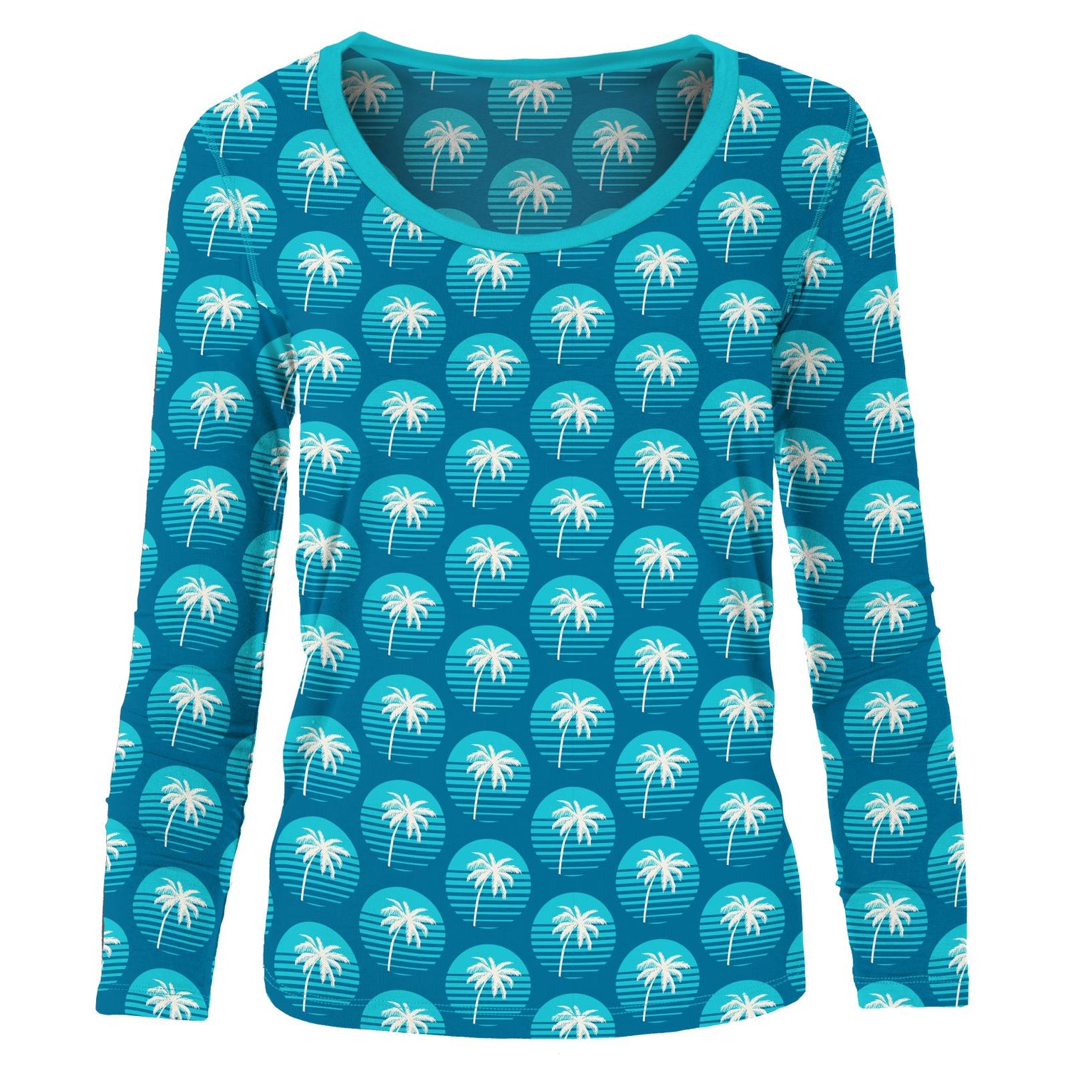 Women's Print Long Sleeve Scoop Neck Tee in Cerulean Blue Palm Tree Sun