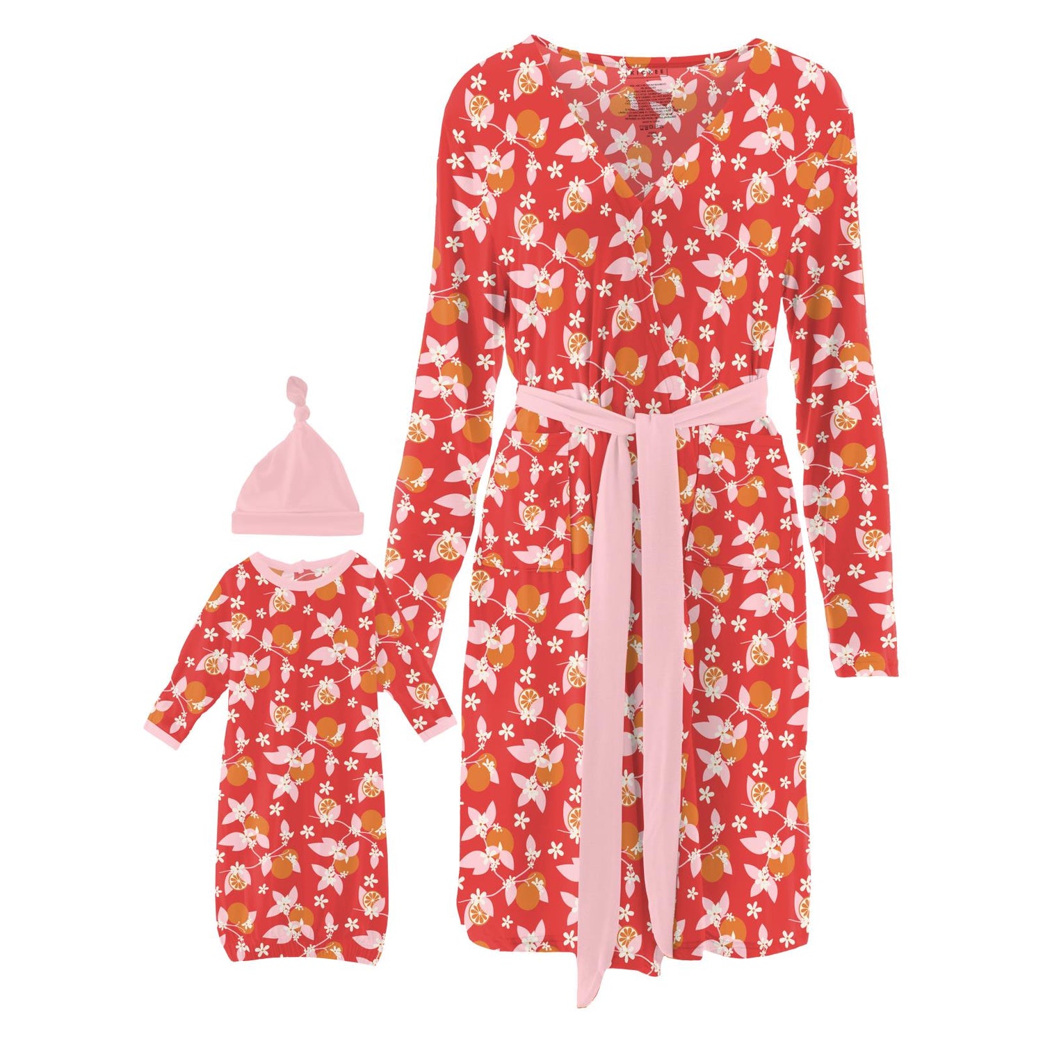 Women's Print Mid Length Lounge Robe & Layette Gown Set in Poppy Orange Blossom