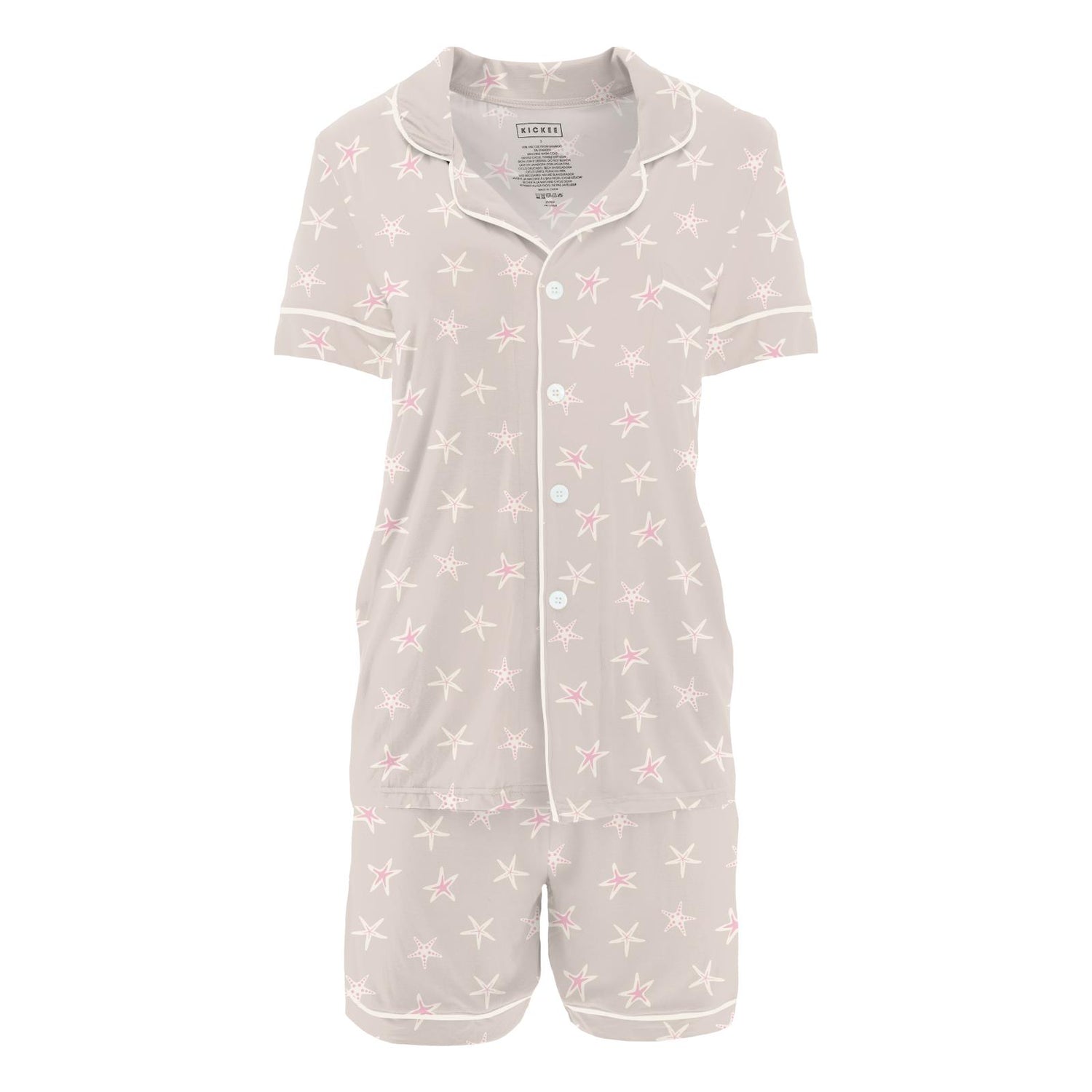 Women's Print Short Sleeve Collared Pajama Set with Shorts in Latte Starfish