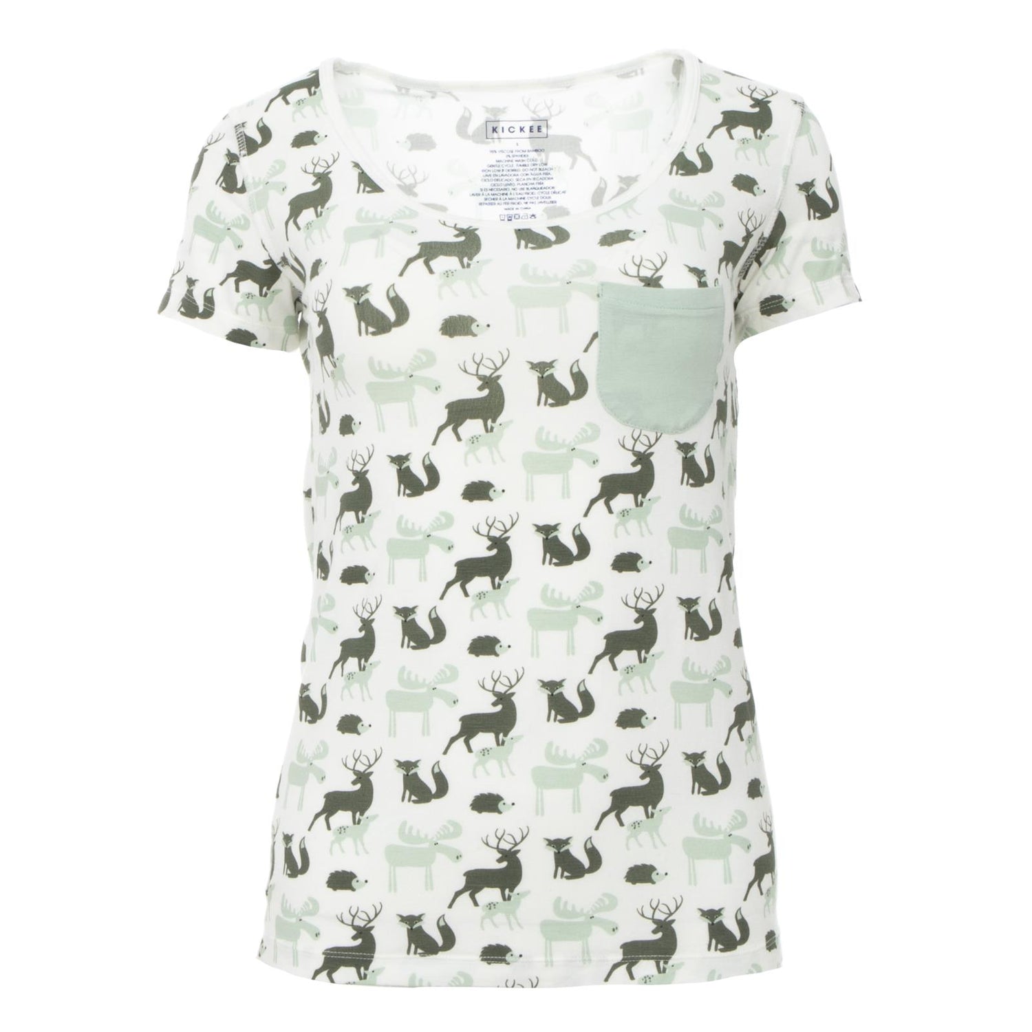 Women's Print Short Sleeve Scoop Neck Tee with Tiny Pocket in Natural Forest Animals